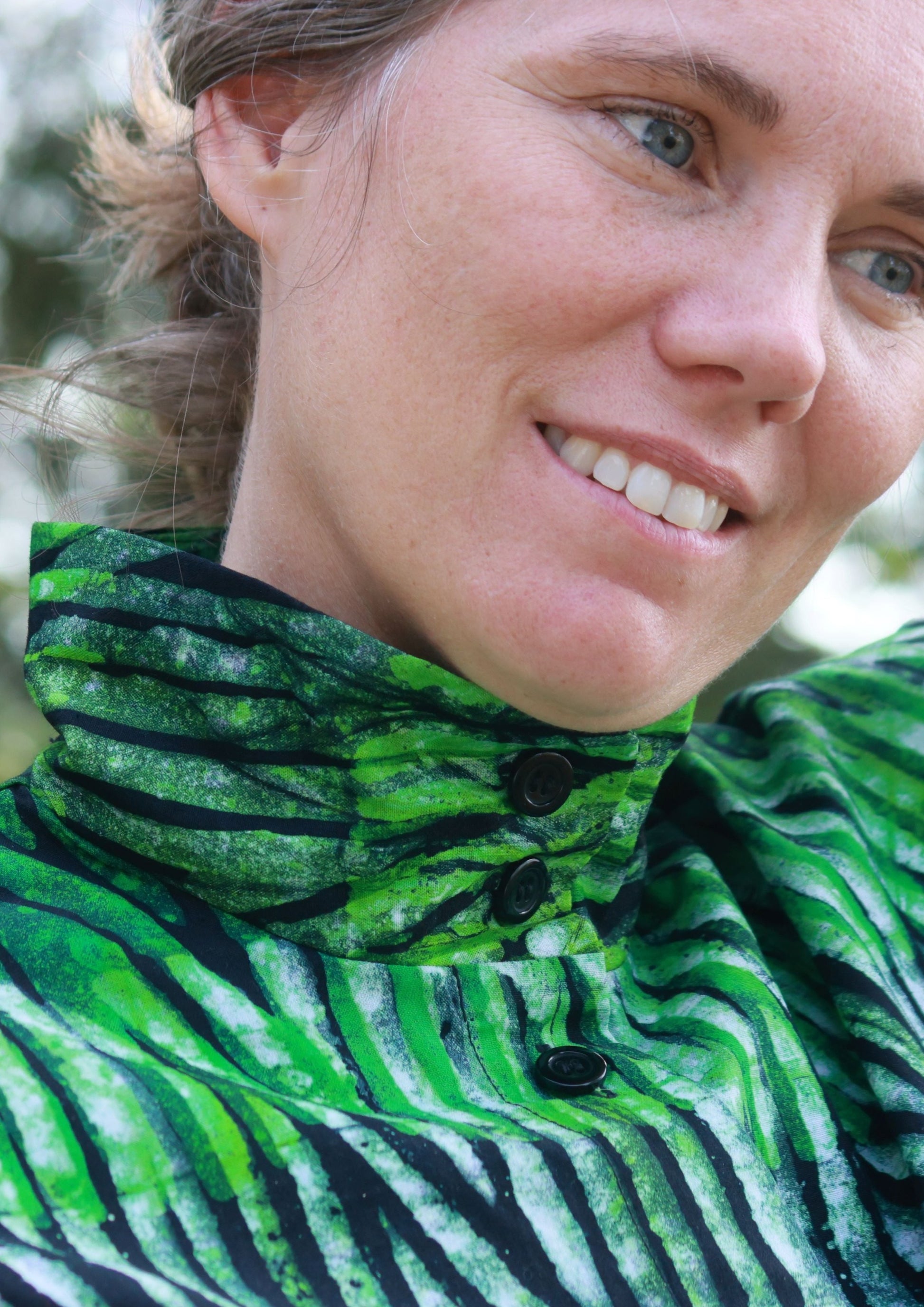 Klänning eller rock med stående krage och rymliga fickor i tyget Green Legon. Handfärgad och handsydd i Accra, Ghana. 100% bomull.