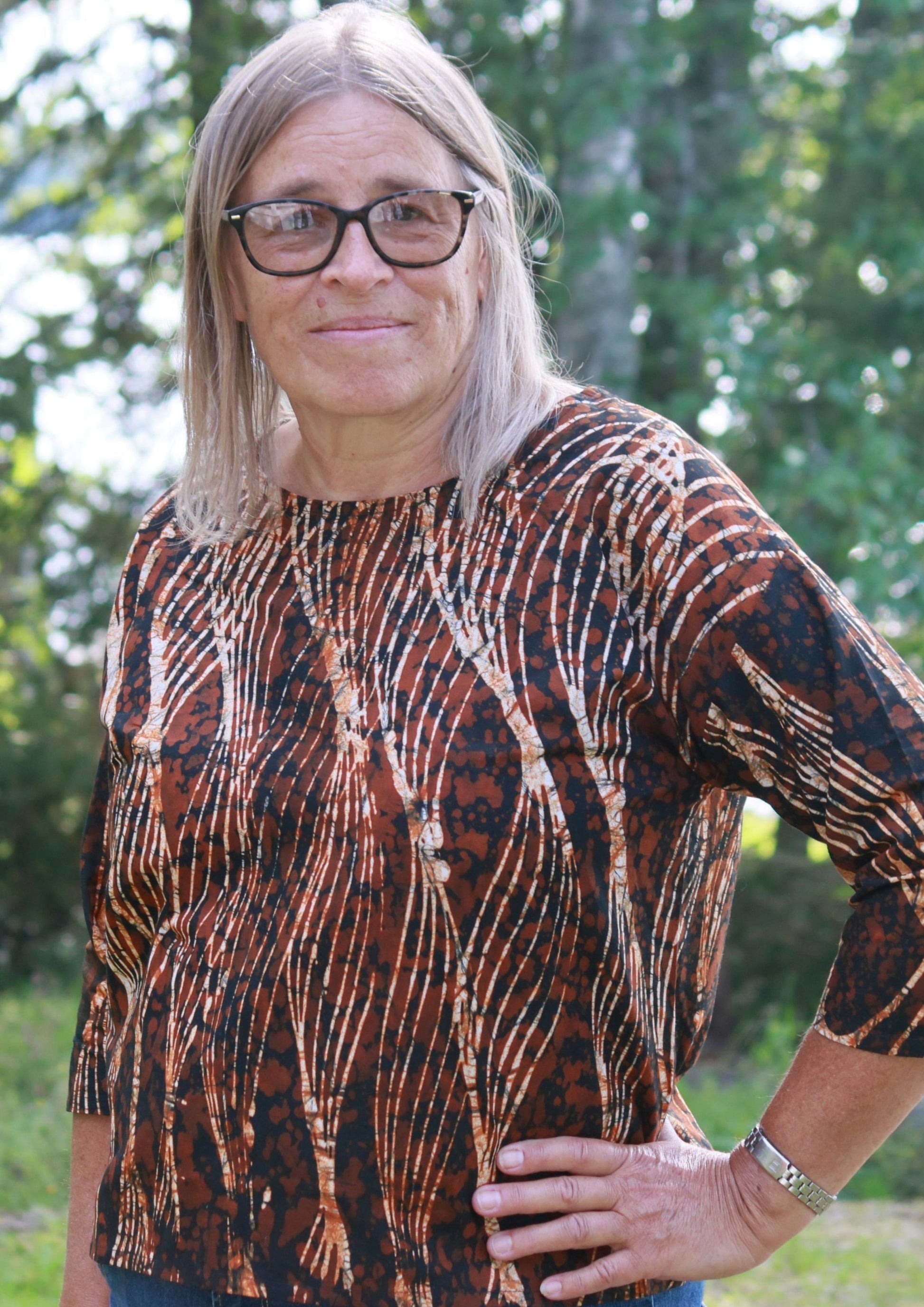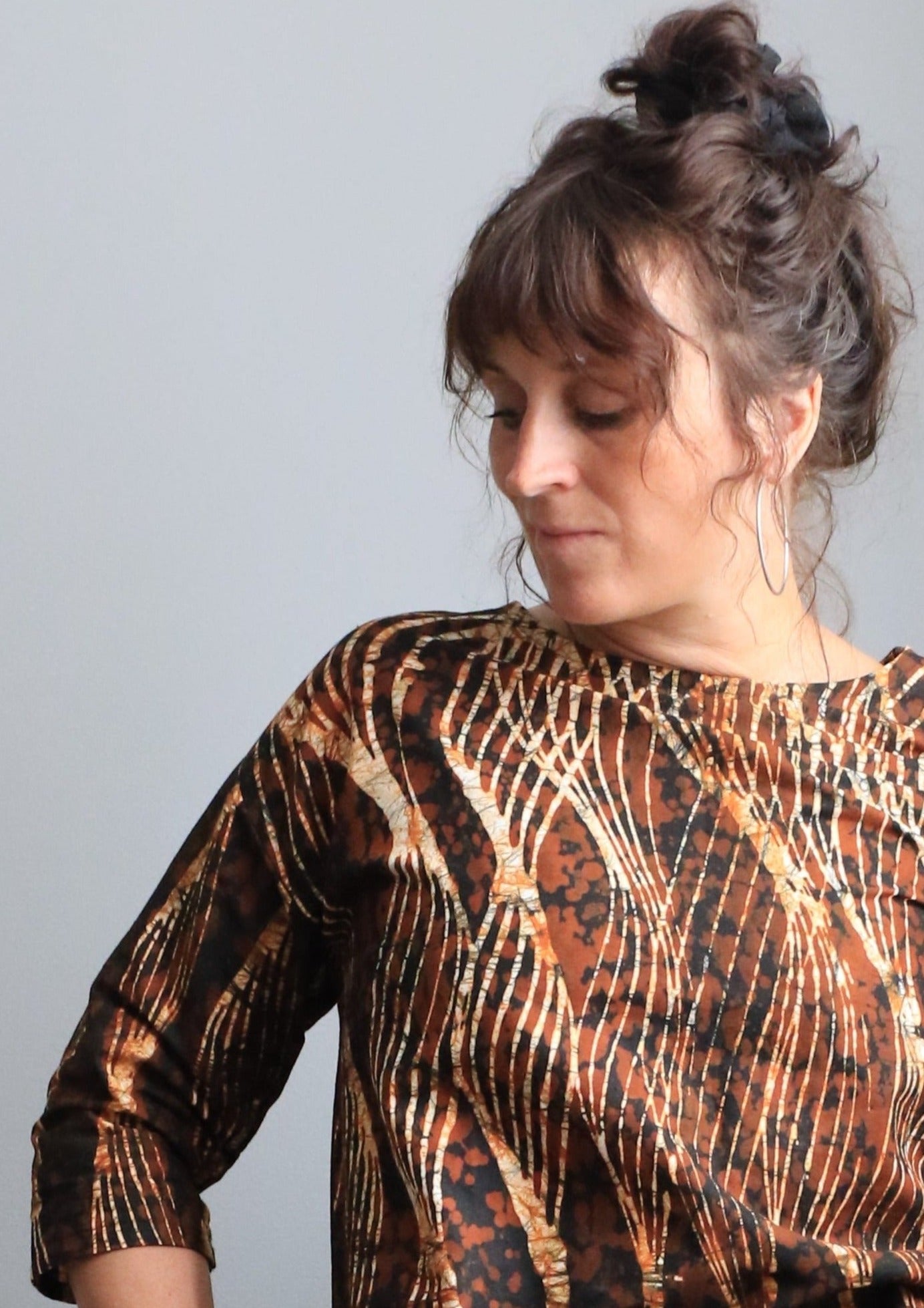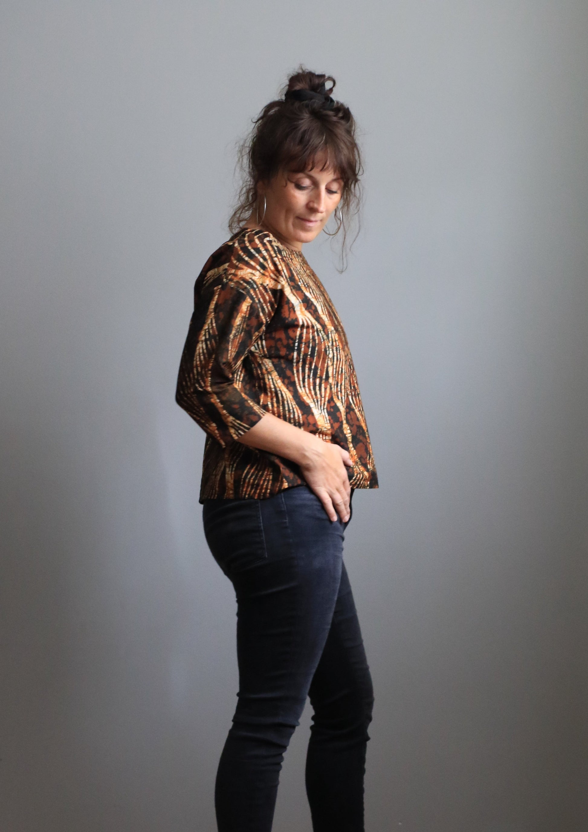 Boxig topp med 3/4-ärmar i tyget Brown Osu. Handfärgad och handsydd i Accra, Ghana. 100% bomull.
