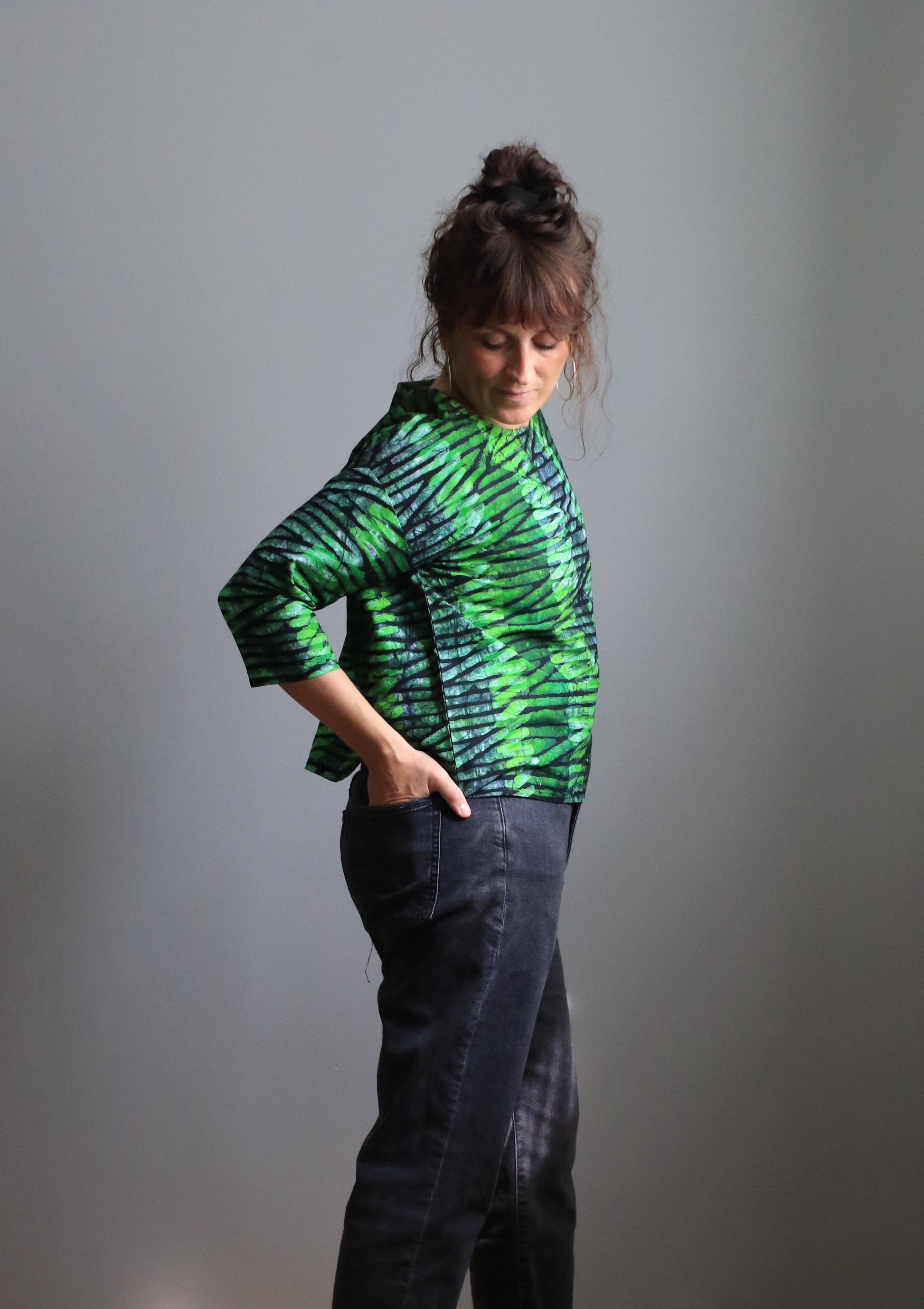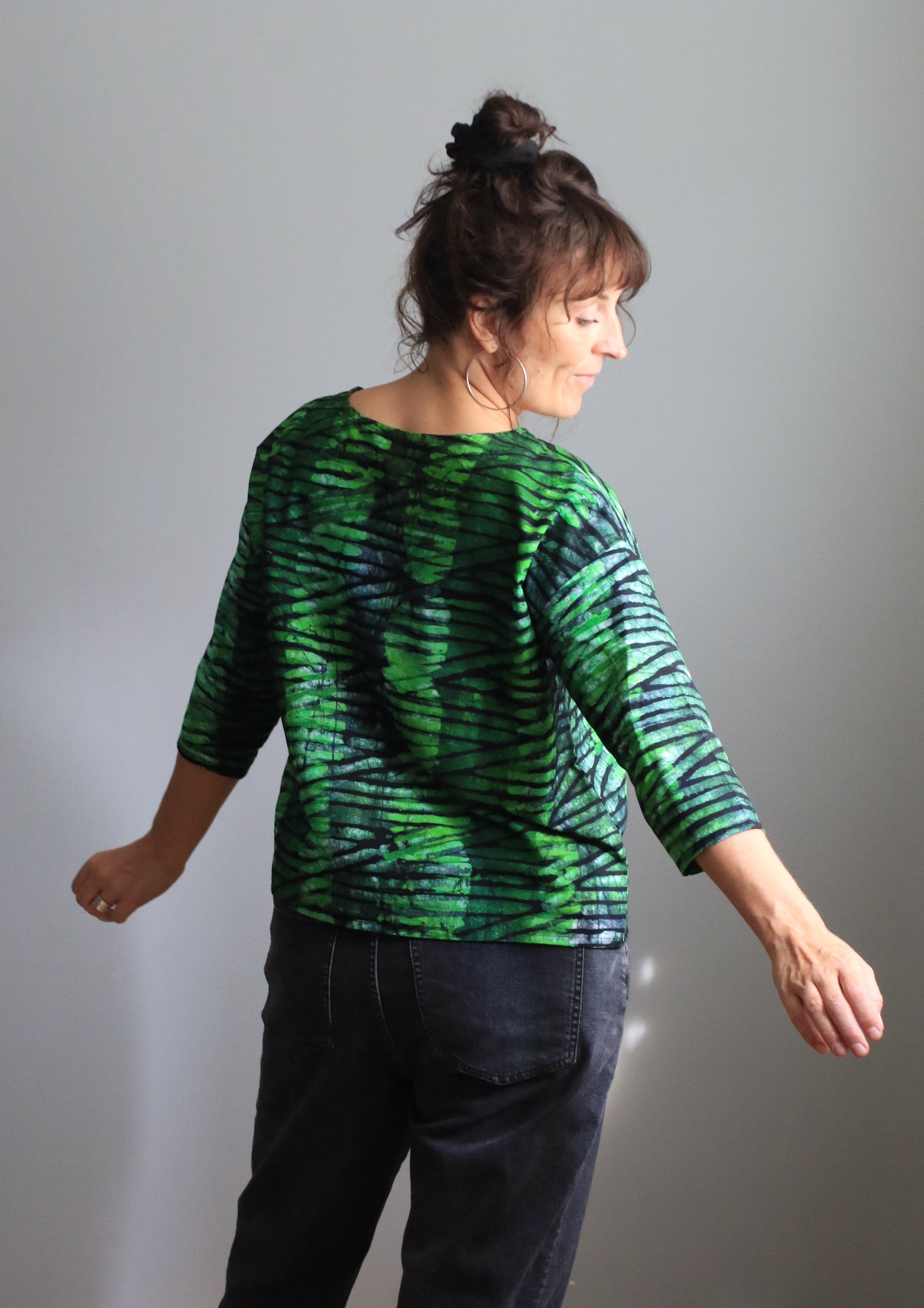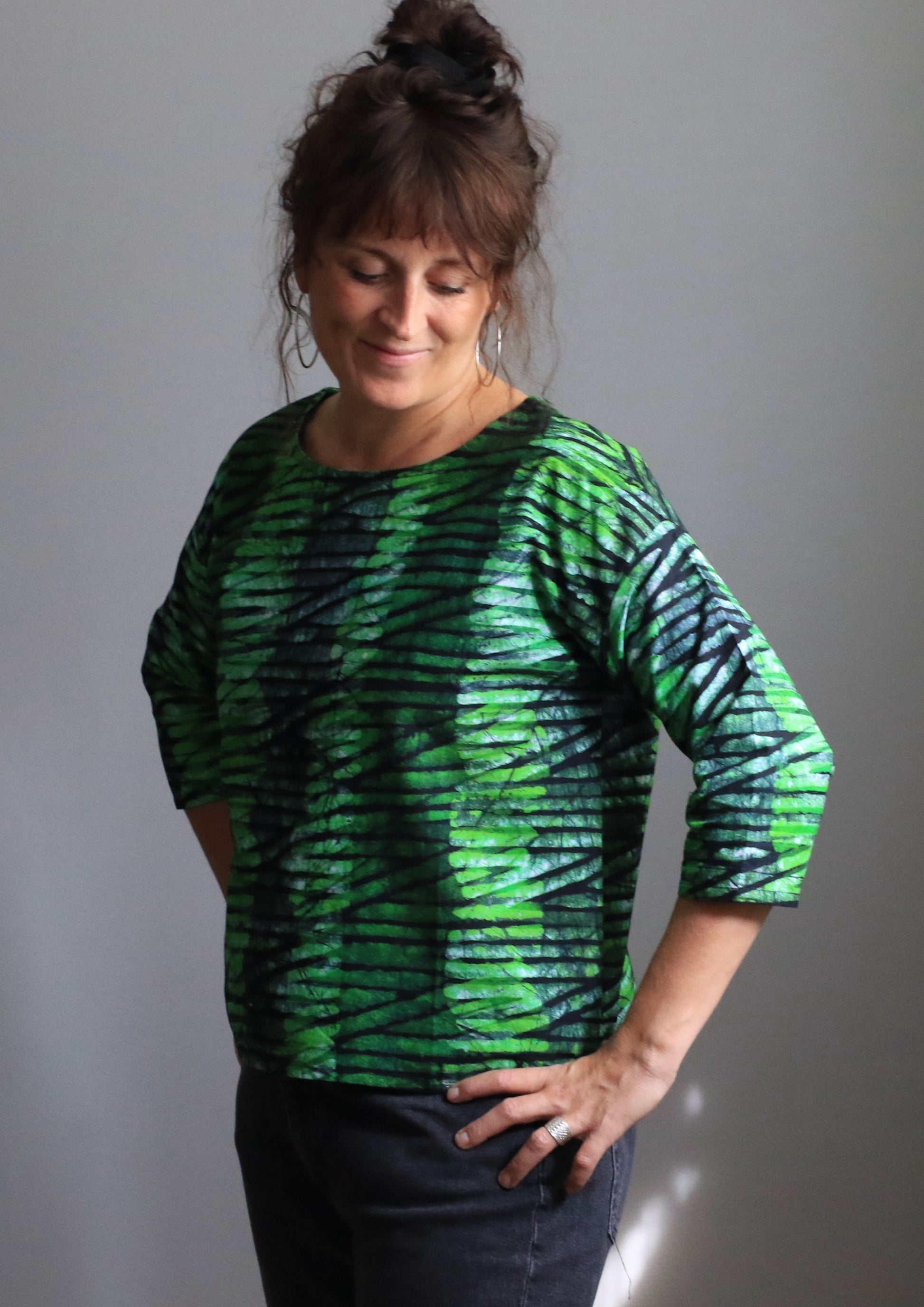 Boxig topp med 3/4-ärmar i tyget Green Legon. Handfärgad och handsydd i Accra, Ghana. 100% bomull.