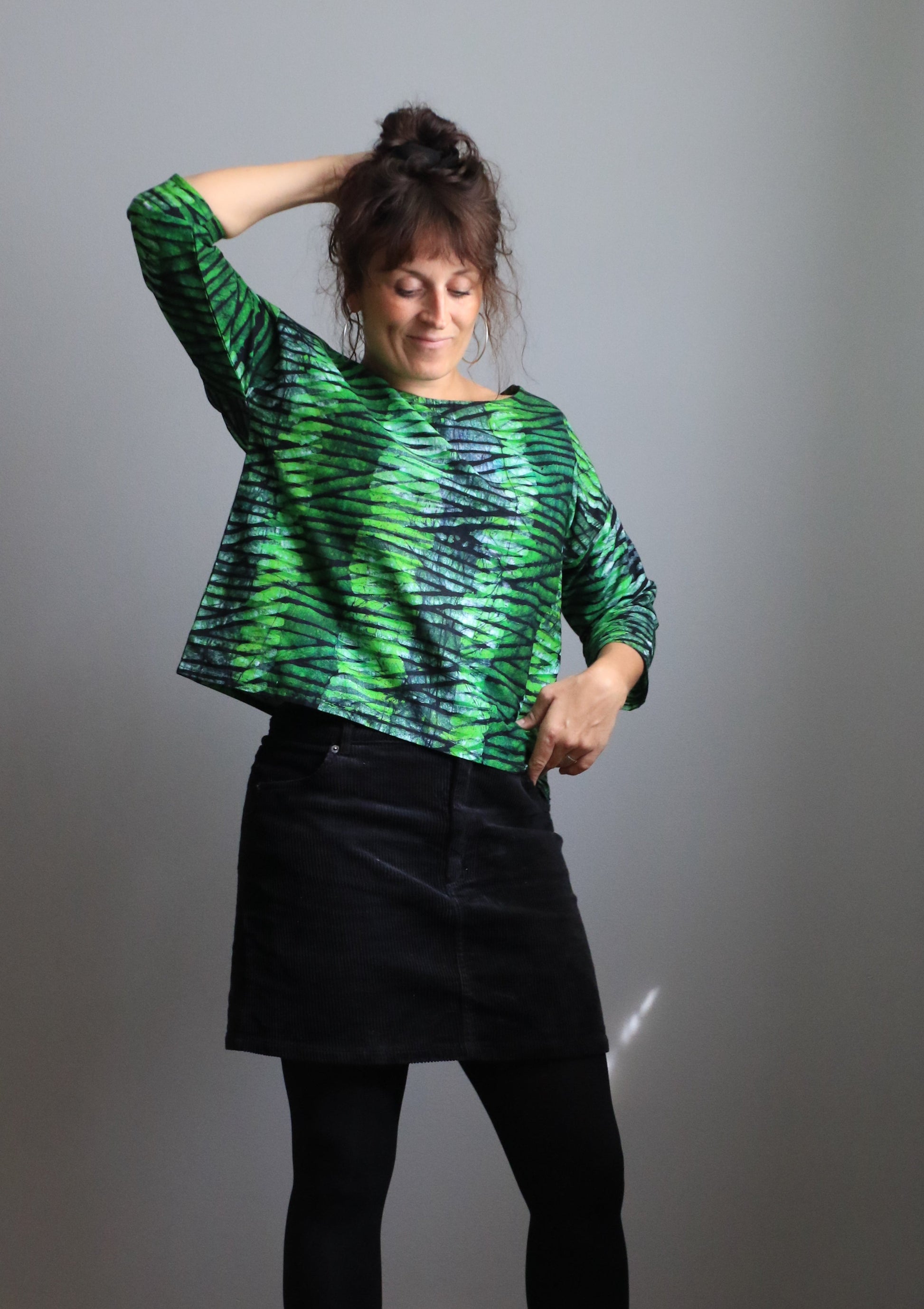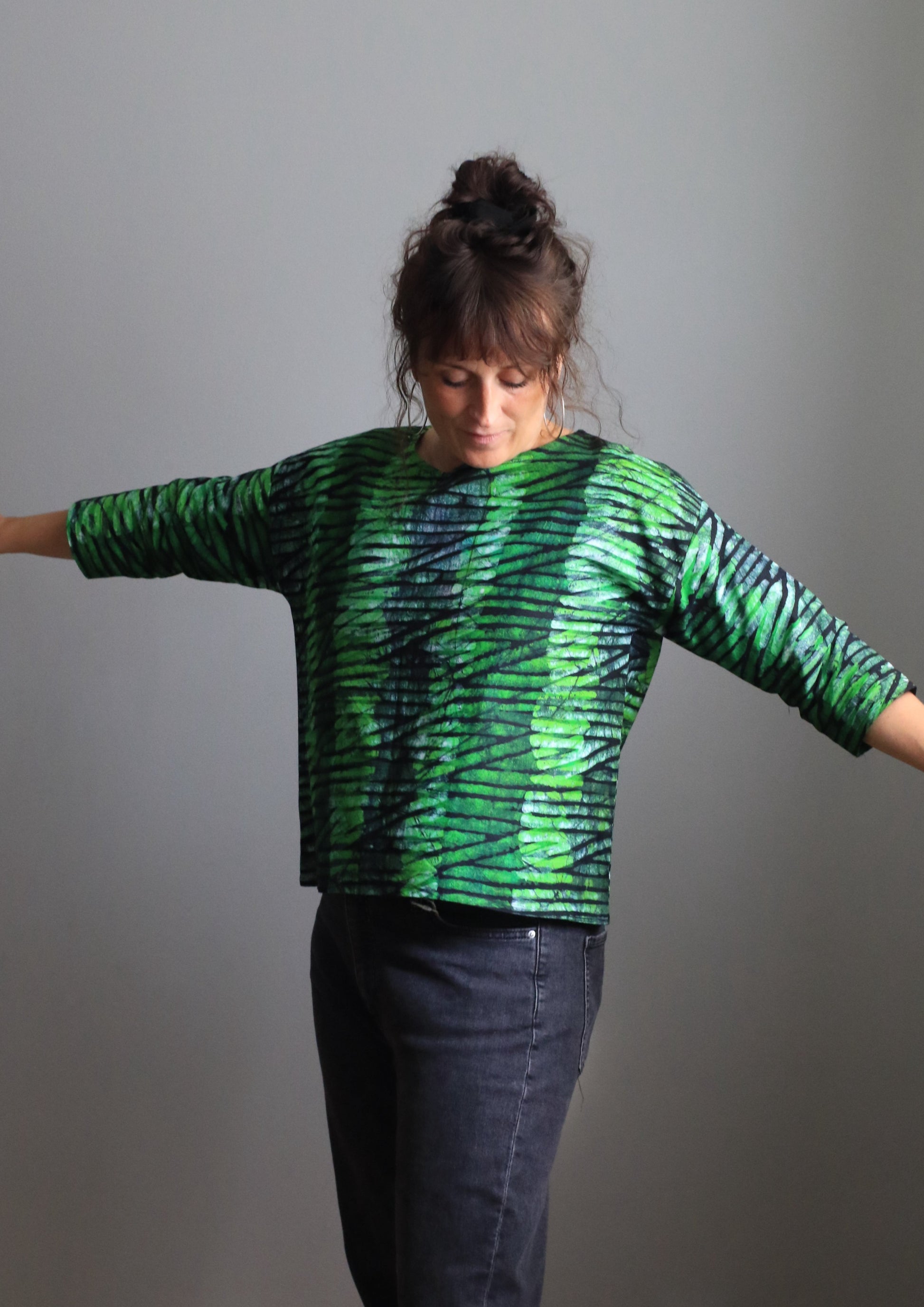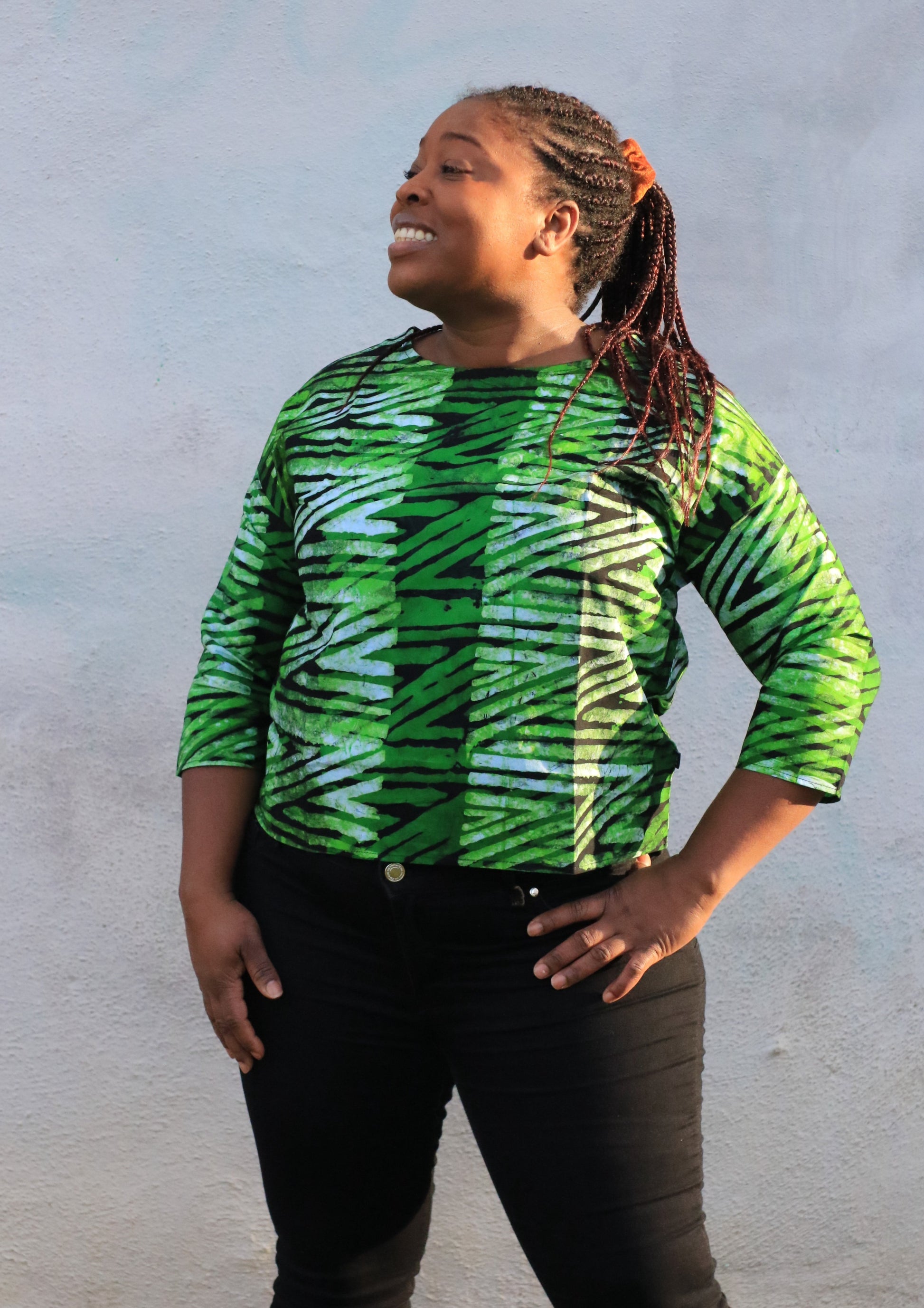 Boxig topp med 3/4-ärmar i tyget Green Legon. Handfärgad och handsydd i Accra, Ghana. 100% bomull.