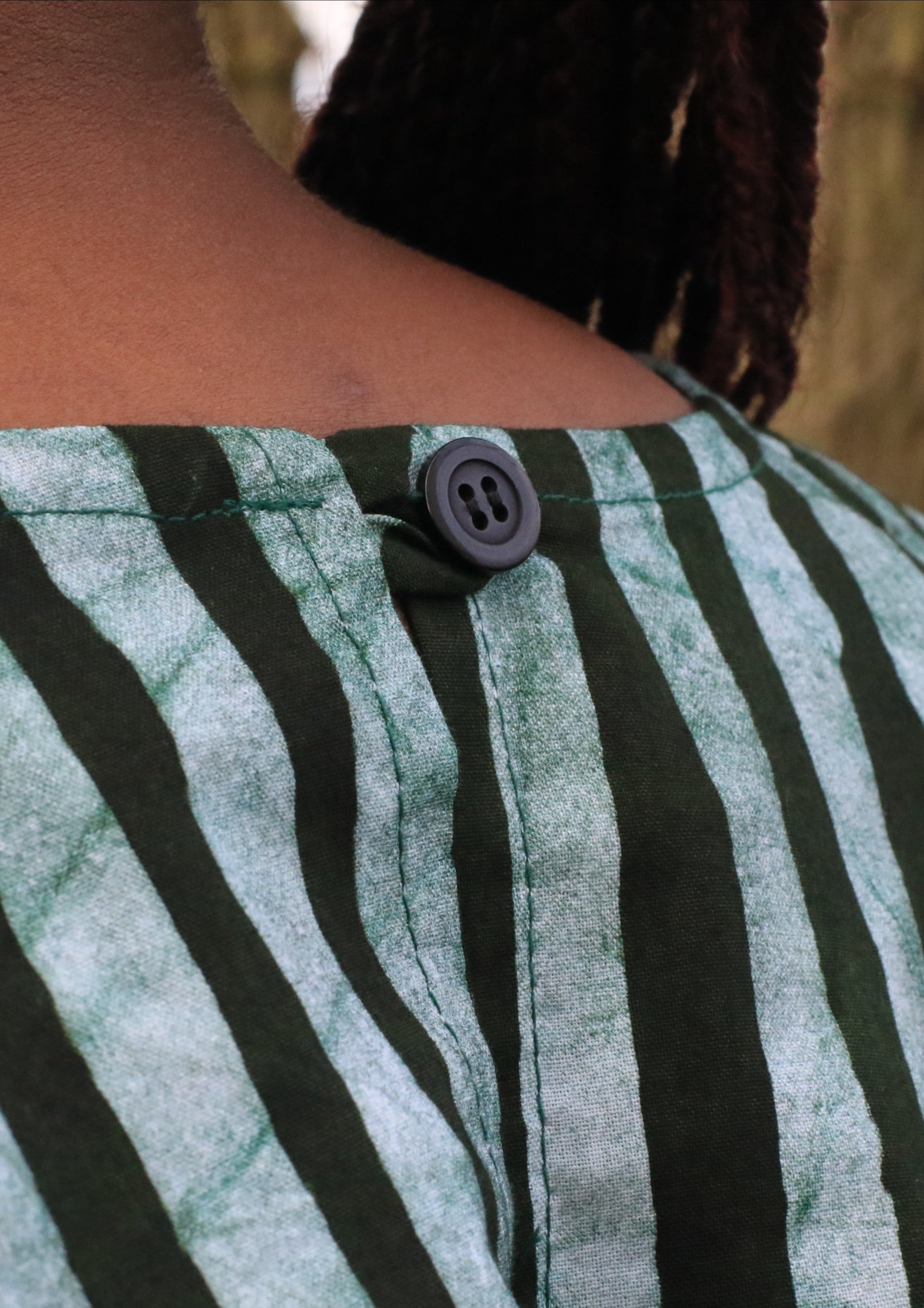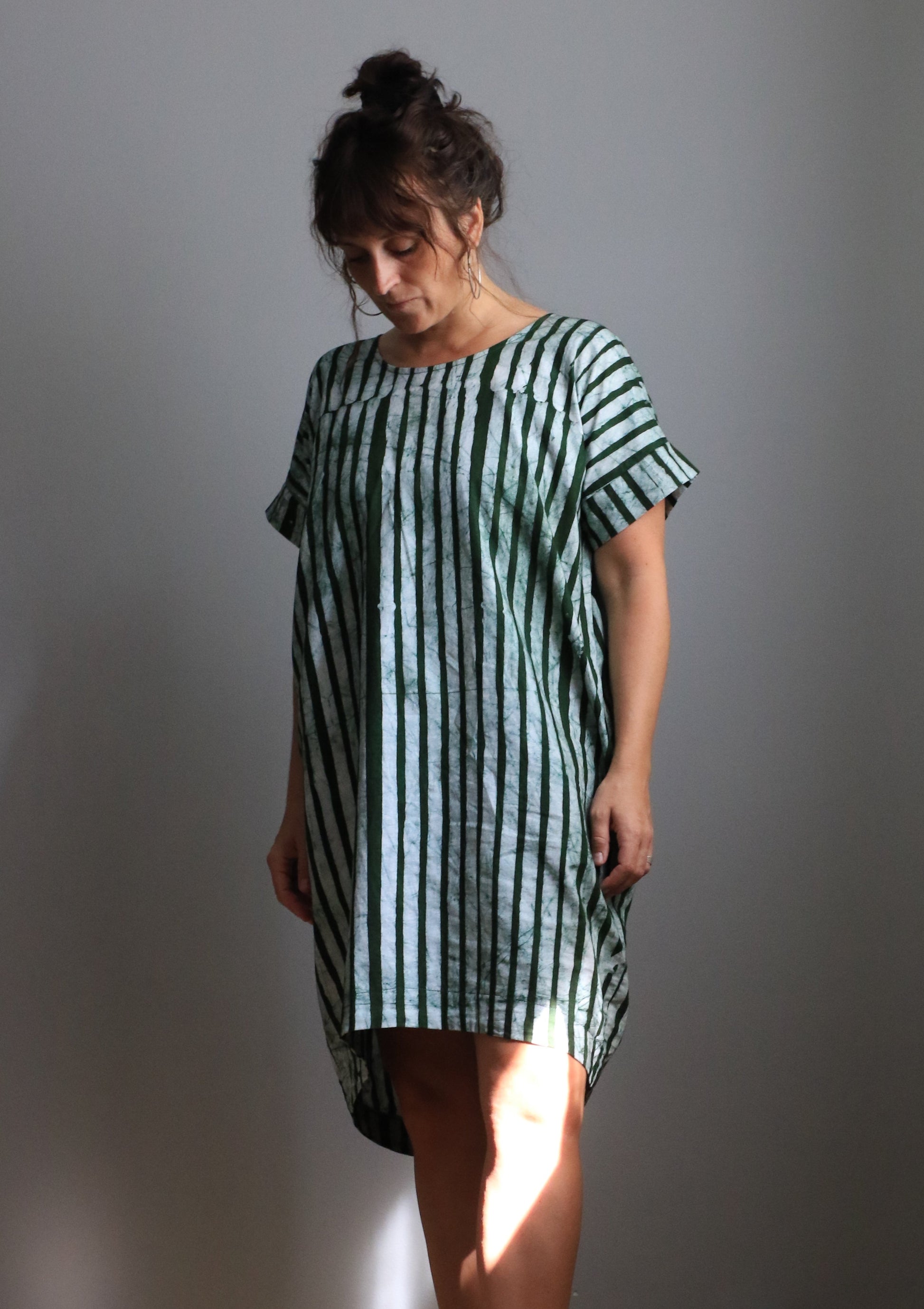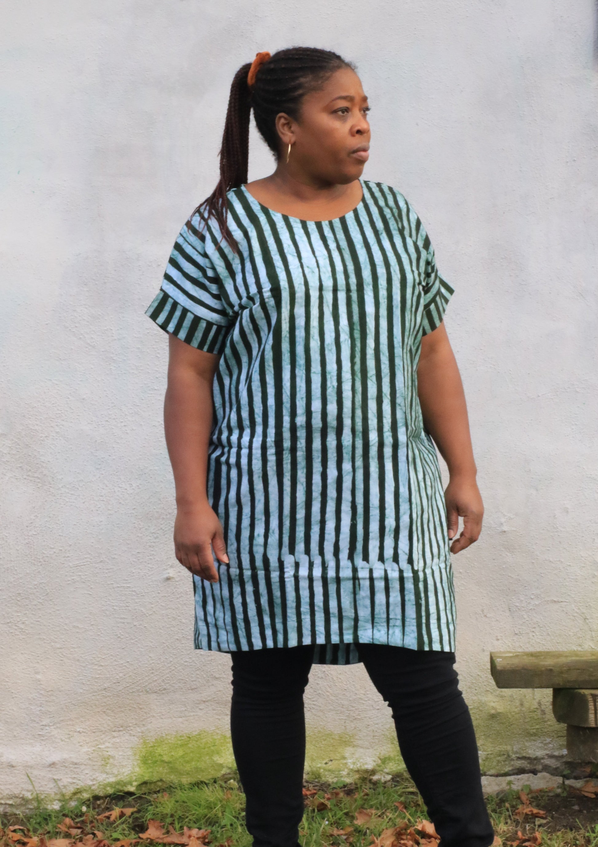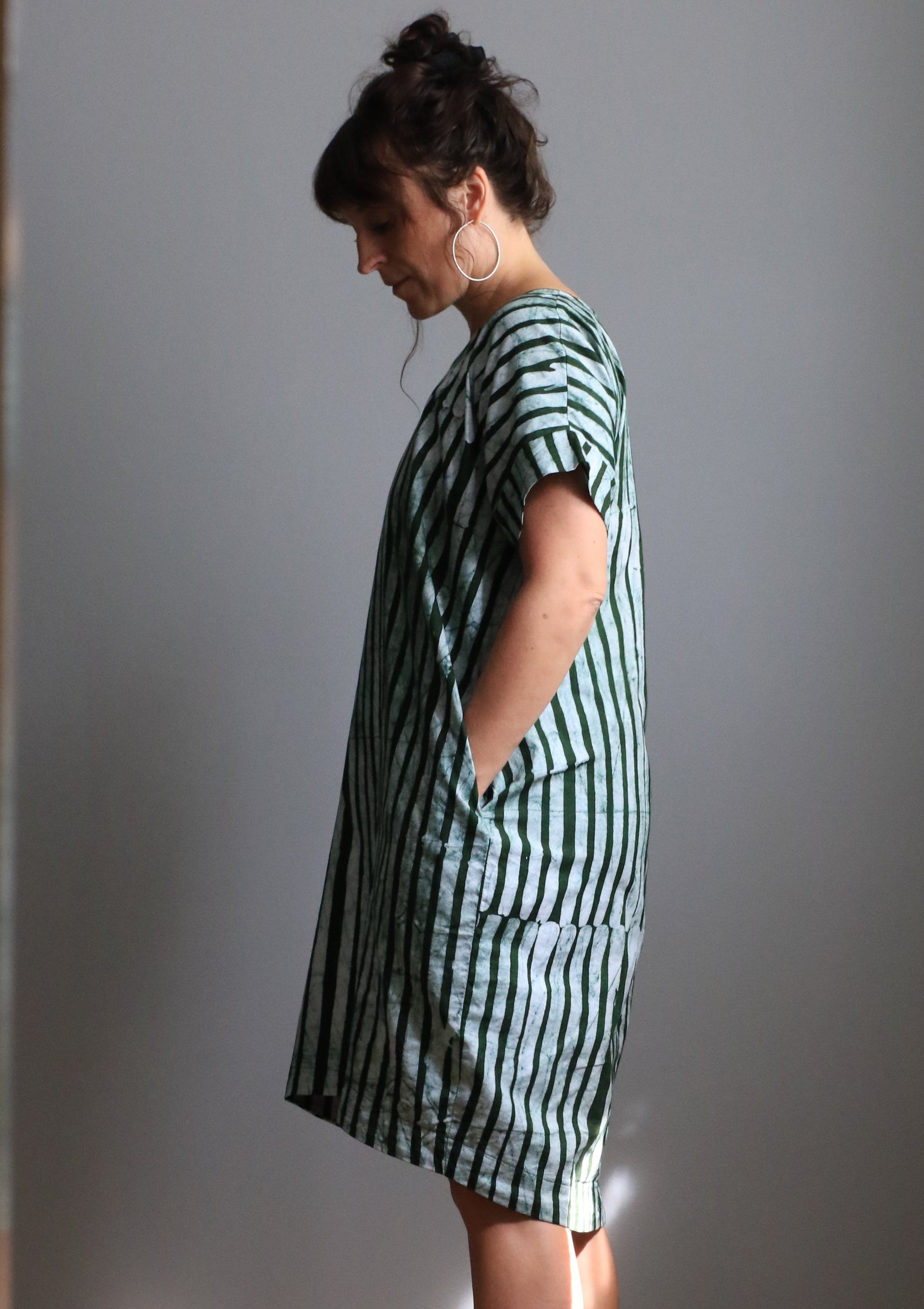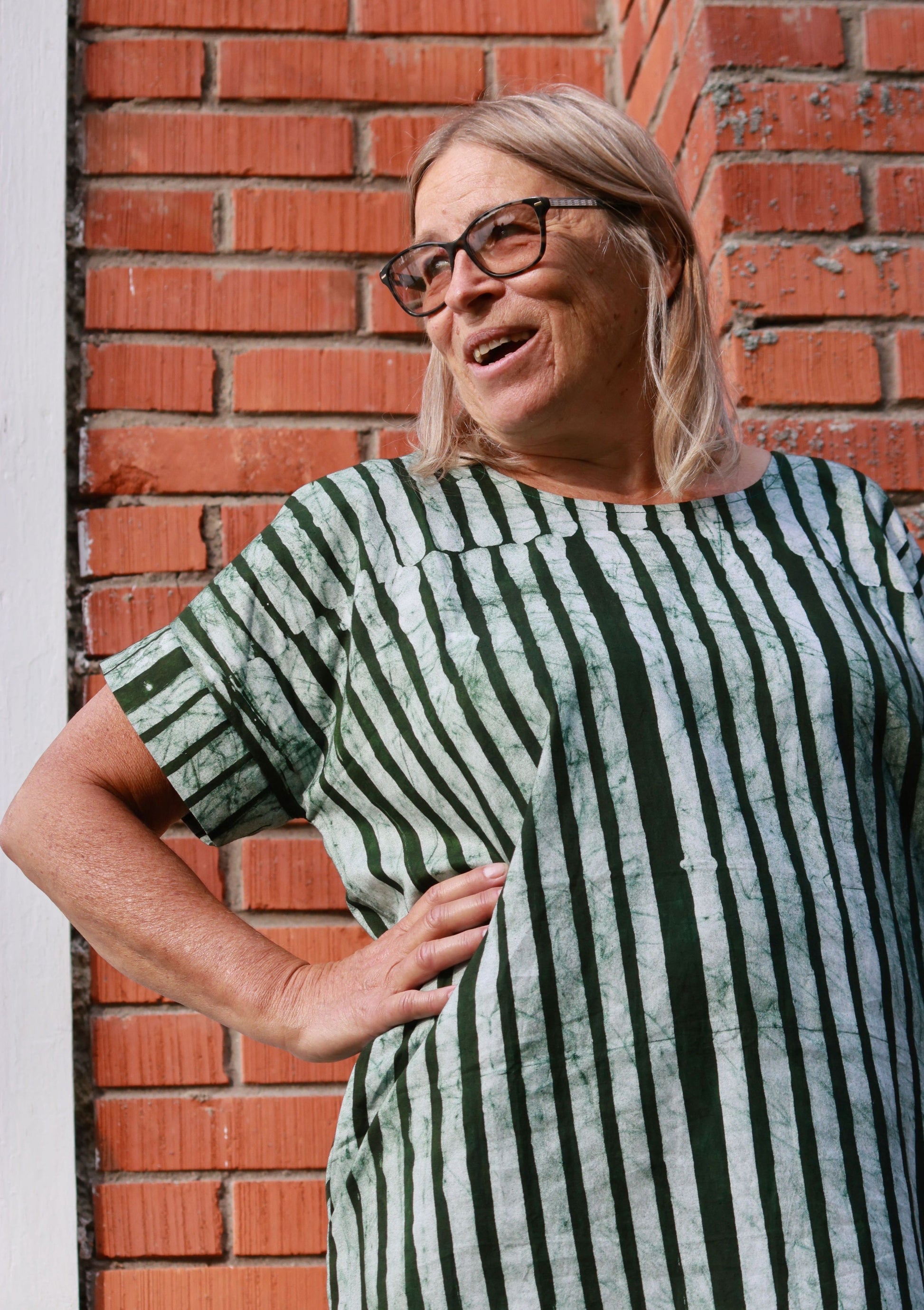 Löst sittande klänning med korta ärmar och fickor i sömmen i tyget Green Makola. Handfärgad och handsydd i Accra, Ghana. 100% bomull.