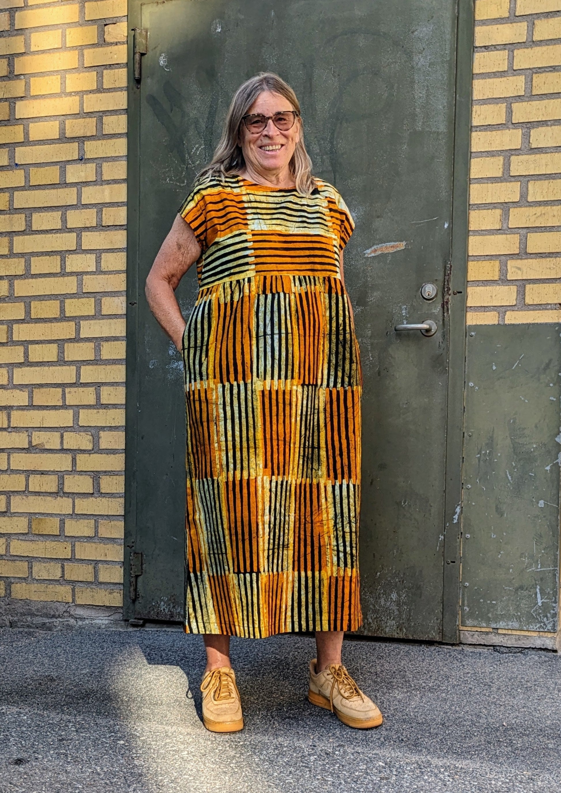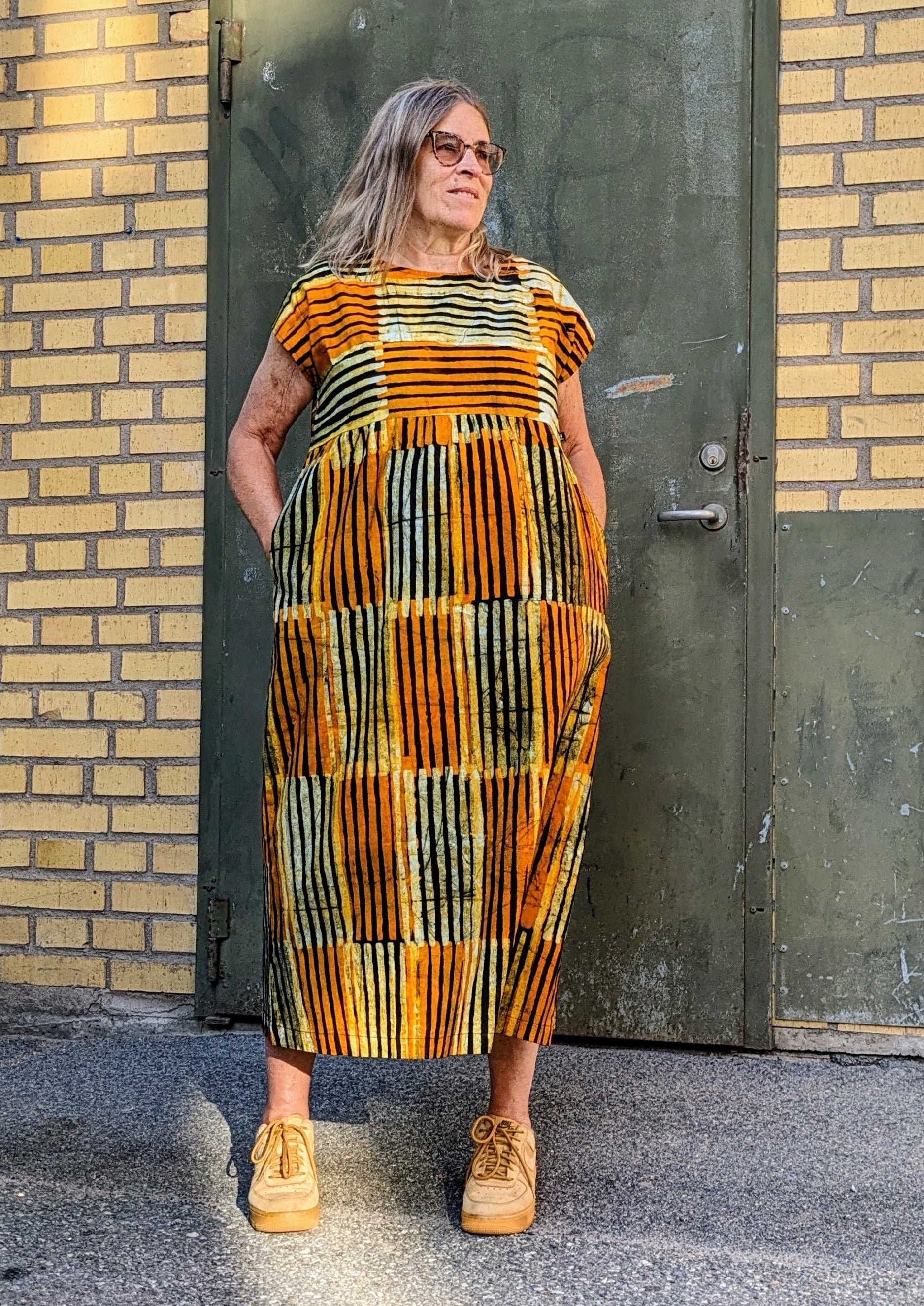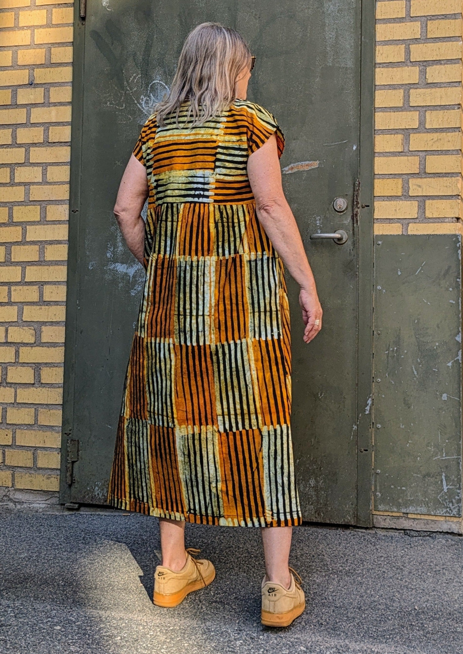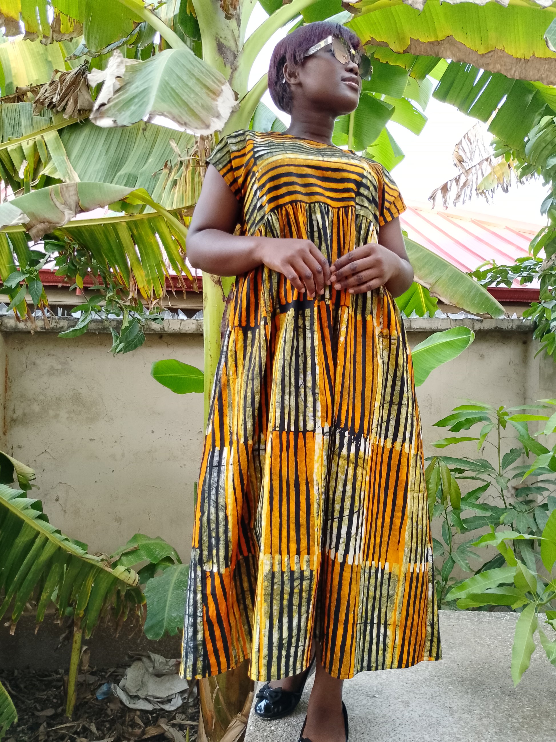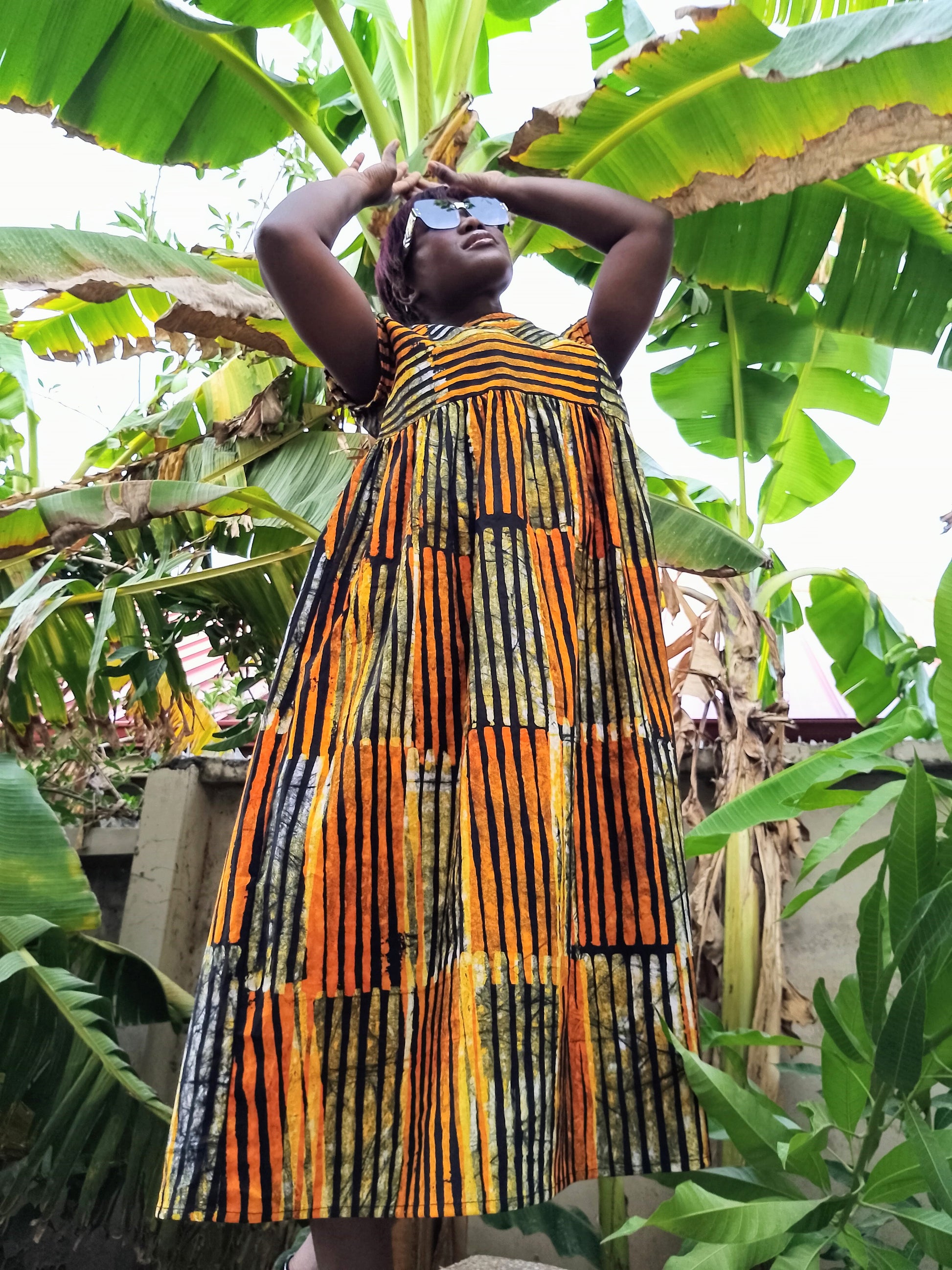 Loose-fitting ruffle dress with short sleeves and in-seam pockets in Orange Nima, handcrafted in Accra, Ghana. 100 % cotton.